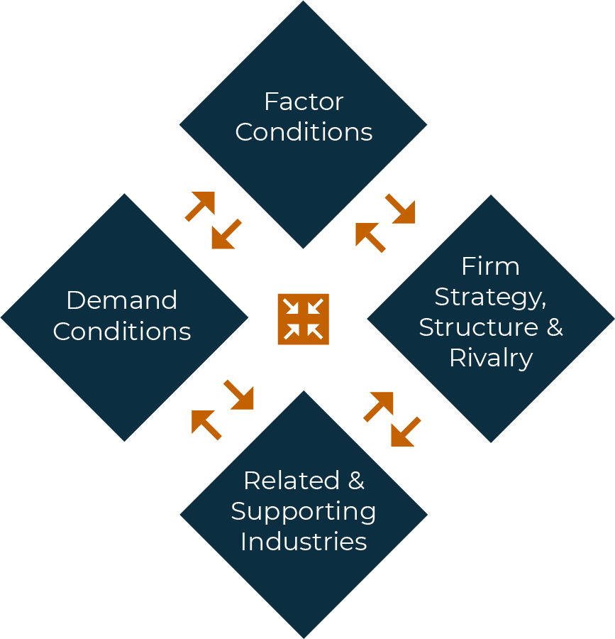 Porter’s Diamond: Porter’s Diamond model demonstrates which factors impact a nation’s competitive advantage over another. This allows businesses to research and understand new markets ahead of investing in them to ensure the opportunity is viable. Where we use this most: Strategic Planning