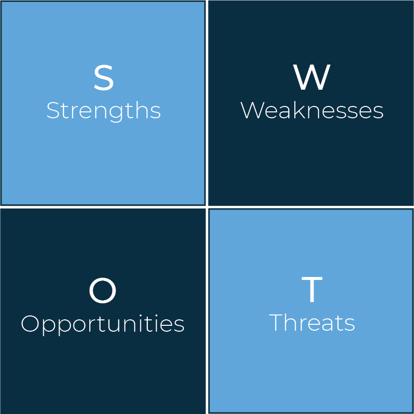 SWOT Analysis: used for the evaluation of both an individual or a business, a SWOT analysis is used to identify the strengths, weaknesses, opportunities and threats to ensure risks are managed and advantages are optimised. Where we use this most: Business planning