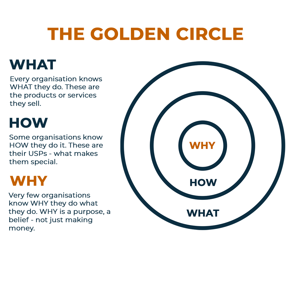 The Golden Circle: developed by Simon Sinek, the Golden Circle is a concept that describes how a business presents a solution to a problem. The focus is removed from “what” the company delivers and focuses in on “why” the company does it. Where we use this most: Shared Values & Culture